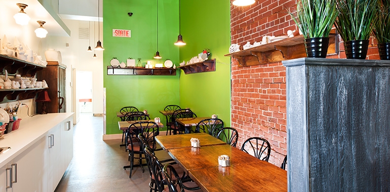 Pour ce décor, nos designers devaient habiller un très grand espace de type commercial. Afin de conserver les murs de briques et les mettre en valeur, elles ont opté pour un vert éclatant pour la peinture. Cette teinte permet aussi de rendre l’endroit très lumineux et, mariée à la brique, on crée une ambiance chaleureuse et invitante pour la clientèle du café. Des luminaires choisis par nos designers ont été disposés stratégiquement afin d’éclairer encore davantage la pièce.